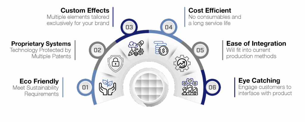 NanoPixel’s state-of-the-art technology is designed to integrate seamlessly with your existing processes and procedures. Whether your product requires a shrink sleeve, sticker-label, or surface-embedded design feature, we offer versatile solutions to meet your needs, including: